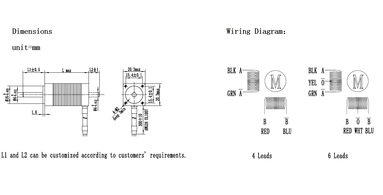| Model No | Step Angle (°) | Rated Voltage (V) | Rated Current (A) | Phase Resistance (Ω) | Phase Inductance (mH) | Holding Torque (g.cm) | Rotor Inertia (g.cm²) | Motor Length (mm) | Lead No. | Motor Weight (g) |