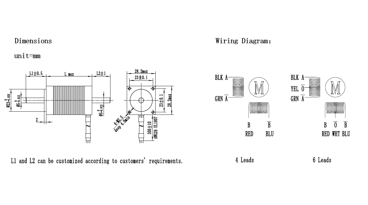 | Model No | Step Angle (°) | Rated Voltage (V) | Rated Current (A) | Phase Resistance (Ω) | Phase Inductance (mH) | Holding Torque (g.cm) | Rotor Inertia (g.cm²) | Motor Length (mm) | Leads No. | Motor Weight (g) |